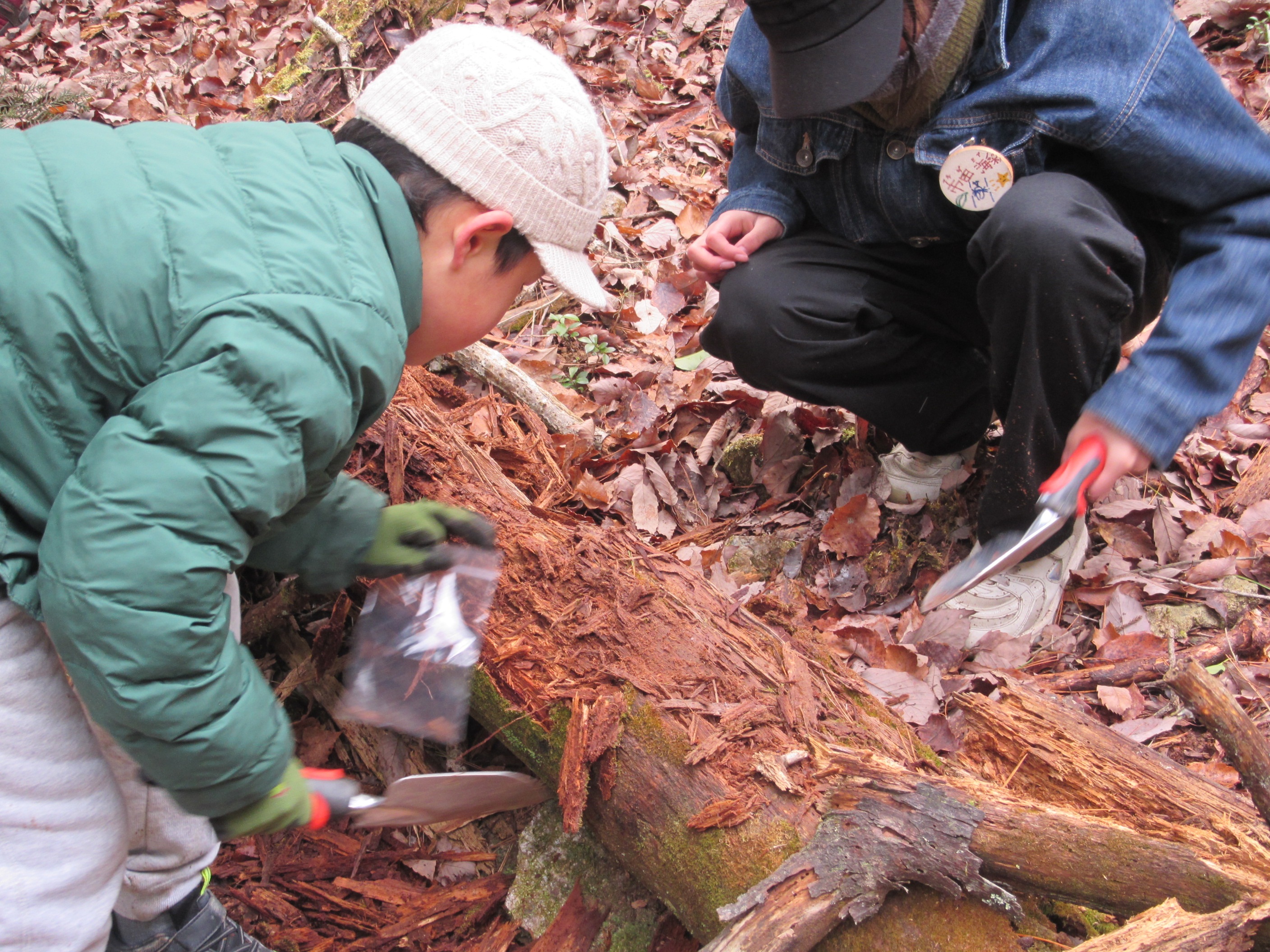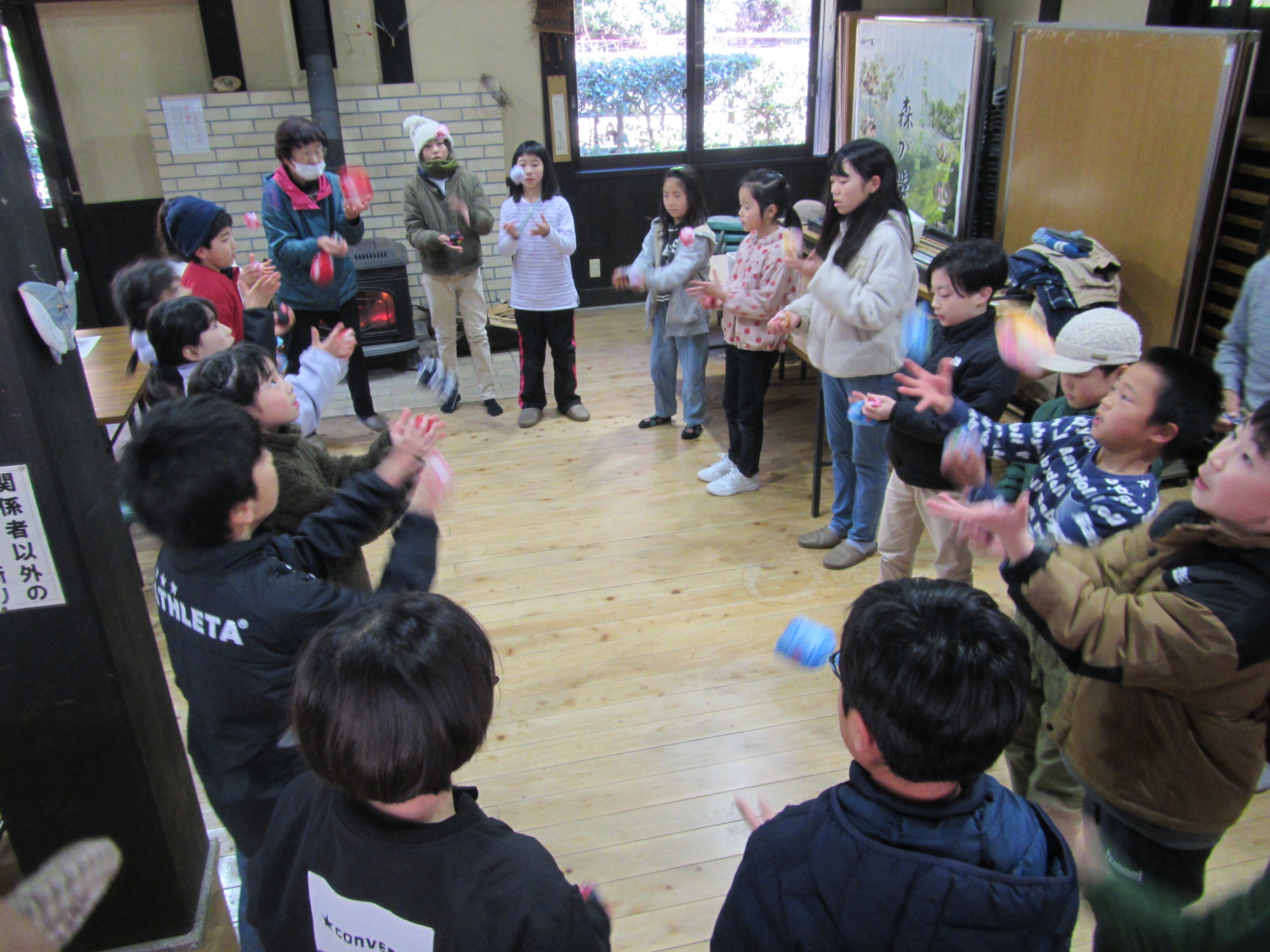 お手玉遊びを基礎から練習しました。 木を切って運びました。寒かったけど汗をかきました。